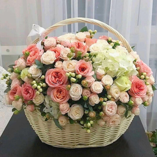 Love Dream basket from Florist-Phuket flower shop. This large flower basket is the embodiment of tenderness and elegance. A large number of pink roses of several shades gives the flower basket lightness, sublimity and declares your sincere and tender feelings. And the addition of white roses and hydrangea along with bright green leaves adds freshness and contrast to the flower basket. Such a basket is a great gift for any occasion from a birthday to a wedding. We recommend ordering Love Dream basket in advance so that our florists have enough time to order the correct shades of roses to create this basket.