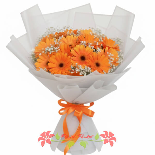 This cheerful bouquet includes 18 bright orange gerberas wrapped in a soft, light-colored material and finished with a vivid ribbon. It is an excellent choice for birthdays, congratulations, thank-you gifts, or any moment when you want to bring color and positivity. Orange gerberas carry a warm, uplifting meaning, making them ideal for friends, colleagues, and loved ones. We recommend ordering 2–3 days in advance to ensure the freshest flowers and proper preparation. Delivery across Phuket is available, with free service in the Patong Beach area and a small surcharge for other locations on the island.